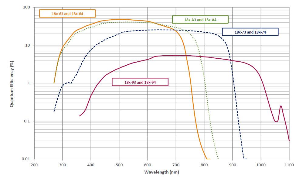 ICCD的响应由增强管的量子效率(QE)决定,后者由输入窗口和光电阴极的组合决定。输入窗口通常决定较低的波长限制,而光电阴极决定长波长响应。