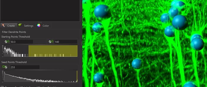 所有创建步骤都可以在切片器上进行验证(中间分割步骤、区域阈值、种子点等)。当在创建过程中同时渲染多个元素时(例如点和阈值,或细丝的树突线和阈值),所有的元素都在同一个切片器上渲染(使用相同的扩展切片设置),以给出这些元素之间的相关性视图。