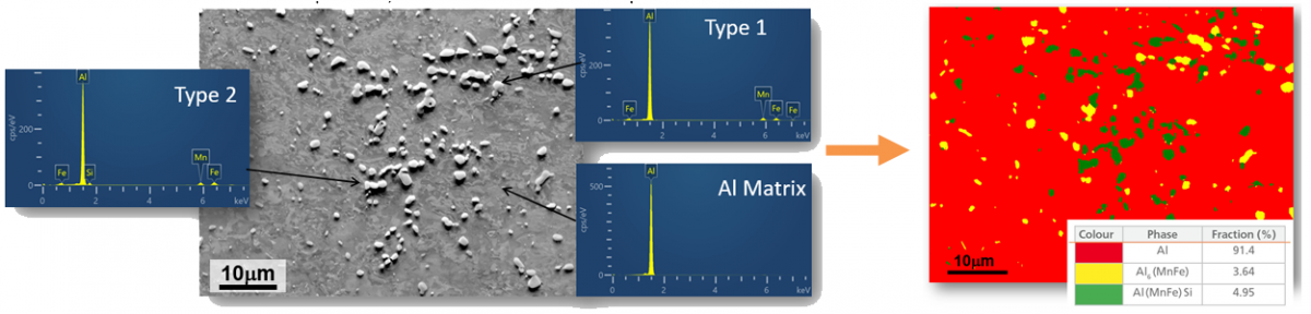 EBSD和EDS的应用可以准确地识别析出物。此外,还能准确地测量其位置、分布和相位分数。通过使用这些工具来监测铝板的质量,可以监测和控制铝罐的制造过程,以最大限度地提高效率。