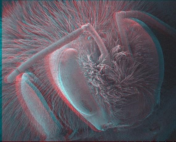 蜜蜂的红青色立体图像。使用立体眼镜可以从图像中获得深度信息。图像可以进行数字处理,为详细的测量和分析提供3D模型。