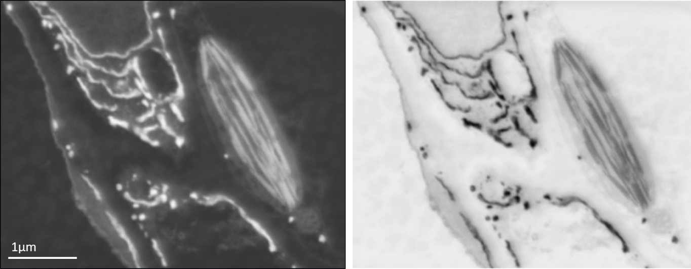 叶片组织的背散射电子扫描电镜图像显示内质网和叶绿体(左)和相同的图像倒置,图像看起来类似于使用TEM获得的数据类型(右)。