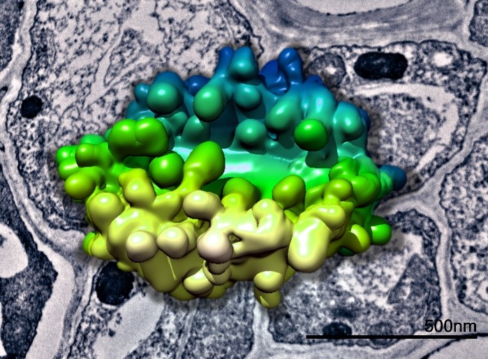 将SBFSEM数据叠加在植物组织的TEM图像上,生成植物高尔基体的三维模型。数据收集与克里斯·霍斯合作。