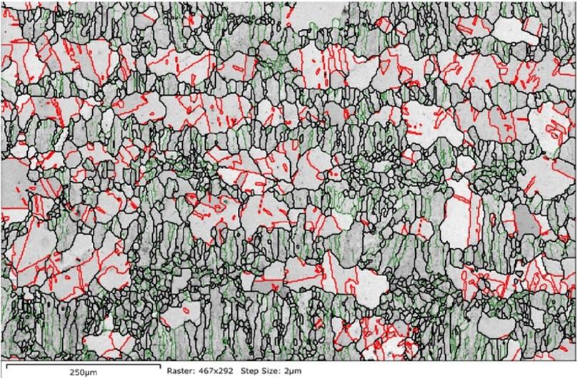 王等人2——EBSD地图低角度(绿色),高角度(黑色)和双(红色)在Cu-15Ni-8Sn合金晶界。