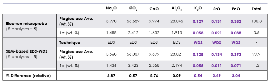 电子探针和sem - EDS-WDS联合测定的斜长石平均成分见下表。在这两种情况下,定量结果显示为未归一化,氧计算化学计量,元素丰度表示为氧化物wt. %。次要元素用紫色突出显示,两种技术之间的相对差异百分比≤3%。