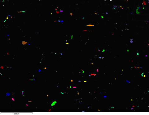 Normally the entirety of a filter will be analysed automatically to ensure every particle is found. Fig. 3 shows a montaged image from a total circle area in excess of 506mm2. 31249 particles were detected, analysed, and classified in real time. Particles are coloured by their classification as shown in Fig.4.