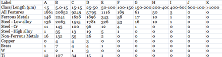 Table 1: Subset of Technical Cleanliness Results for this sample reported to the size bins defined by ISO16232 and VDA 19.