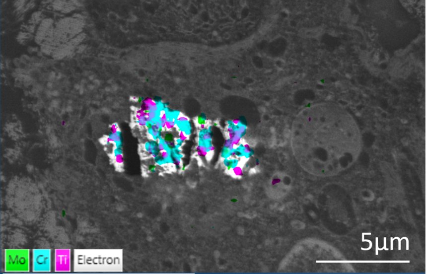 空气中的微粒和空气污染是主要的接触源,在以前已经讨论过博客而且在线研讨会,其中能量色散x射线光谱法(EDS)是自动表征微粒物质的重要工具。外界接触纳米颗粒并不是唯一的担忧来源。微粒也可以从植入材料内部产生,只要不同成分的表面接触到。某些类型的种植体产生的磨损颗粒比其他种类的多,故障率也相应较高。2003年至2013年间,某些类型的髋关节植入物失败的发生率非常高(根据国家联合登记处的数据,5年内髋关节植入物失败的发生率在5-37%之间),仅在英国就影响了不到7万名患者。目前尚不清楚为什么有些患者的反应比其他人更强烈,但关节失效后植入体周围的组织显示出高水平的磨损颗粒。