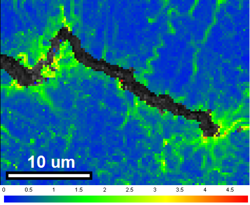 材料内部的变形和应变会影响该材料在结构完整性是构件设计重要考虑因素的应用中的适用性。万博电脑网页版登录这意味着了解材料内部的应变和变形是非常重要的——EBSD是研究这一问题的理想技术。下面您可以看到用于航空航天工业的镍高温合金样品的地图-具有相当大的晶粒内变形。在这里,我们使用EBSD来可视化应变的位置和局部梯度。您可以看到裂缝周围的应变水平是如何变化的,蓝色表示低应变水平,而从绿色到红色表示高应变水平。这类图像被称为Kernel平均定向错误图,显示了塑性应变。这张地图是在2900秒收集的,只花了4秒就获得了-一些非常重要的信息收集得非常快!