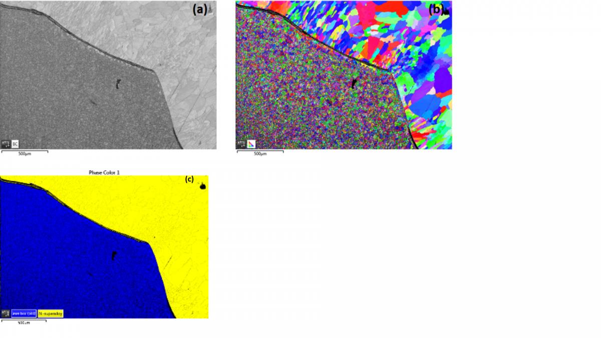 EBSD (a)能带对比,(b)马氏体9Cr钢与FCC焊缝金属界面的取向图和(c)相图。