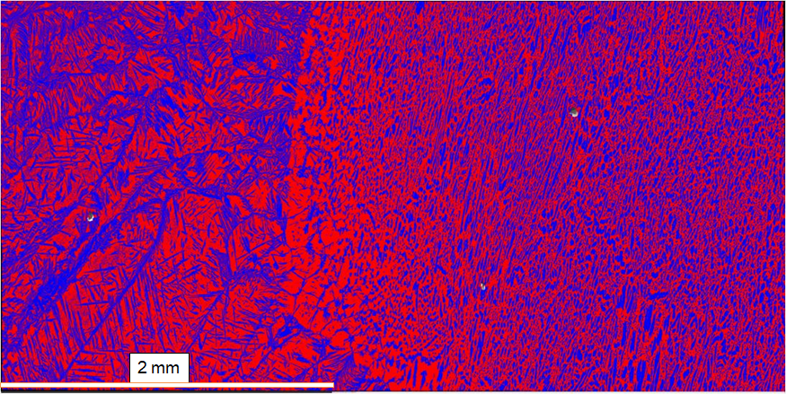 图1a montage of 96 individual maps over a steel weld. The map shows the microstructure and distribution of FCC (blue) and BCC (red) phases over the weld. This sample is approximately 5mm across and these data were collected at a working distance of 15mm