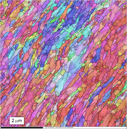 At one end of the typical length scales applied in the SEM we considered large samples. These were typically on the cm scale, composed of larger grains and required automated large area mapping to acquire statistically meaningful data, as in Figure 1. The converse was a heavily deformed alloy which required analysis on the submicron scale. To achieve the highest spatial resolution an electron transparent TKD sample was used, Figure 2.