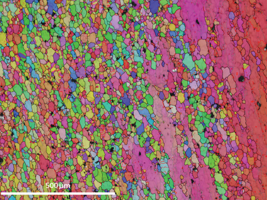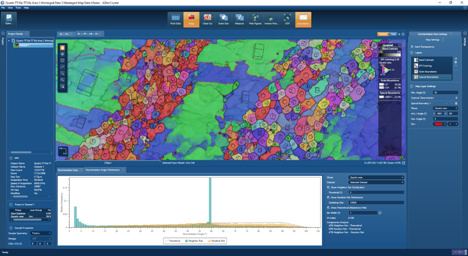 能够密切参与一项发展如此迅速的技术是令人兴奋的,它将从一个小众产品转变为可以广泛应用于许多应用领域的主流工具。然而,这并不完全是关于探测器和采集速度:为了有效地分析由我们的超高速CMOS探测器产生的越来越大的数据集,我们不得不完全重新开发我们的数据处理软件。这个月我们推出AZtecCrystal,这是我们几年来专注于EBSD数据处理的成果。我们的目标一直是开发与探测器技术和获取速度相匹配的数据处理软件,使研究人员更容易从他们的数据集中提取必要的信息,无论他们的专业水平如何。其结果是,软件是直观的使用,但提供了从EBSD分析提取关键数据所需的全套分析工具。而且,重要的是,它速度很快。作为产品测试的一部分,我喜欢从一系列样本中收集一些非常大的数据集(> 6000万个点),并使用它们来测试AZtecCrystal的处理能力。令人高兴的是,这让我有机会再次看一看我信任的石英岩样本——下面的截图显示了一个“小”的1600万点数据集的分析,用图形突出显示了单个颗粒的方向以及失向角分布。重要的是,开发不会止步于此——我们有许多跨EBSD各个方面的项目正在进行中,所以请期待未来的版本和令人兴奋的新功能。