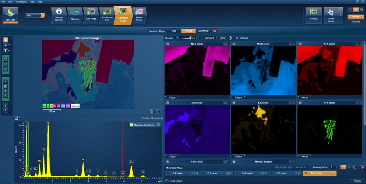 为了说明这一点,我们可以在下面看到一个矿物样本的映射分析。阿兹特克公司自动识别出各个山峰,并显示出相应的x射线图。