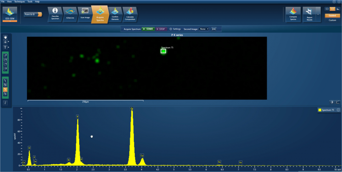 在这种情况下,最可能出现峰值的是磷。通过点击磷标签,AZtec自动显示相应的x射线地图,我们可以立即看到在最初的检查中遗漏的少量磷浓度。