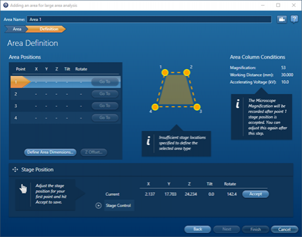 在数据采集过程中,AZtec会自动将样本从一个区域移动到另一个区域,因此重要的是,样本的位置要确保这些移动是安全的。在初始设置期间,通常在样品表面上定义4个点(x,y,z),允许AZtec计算如何调整舞台上的z轴以保持样品表面聚焦,同时移动x,y轴以在视野之间移动舞台。这很重要,否则,如果样品表面没有平行于SEM工作台,样品可能会移出焦点。