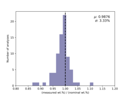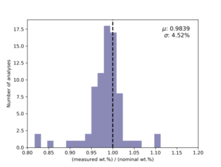 图表显示了每个元素的结果与标准认证成分的接近程度。如果结果完全匹配,那么它将在图上虚线处的1处绘制。如果结果太高,它将被绘制到直线的右侧,如果太低,它将被绘制到左侧。其目的是尽可能得到最窄的分布,表明所有元素的结果都非常接近预期值。