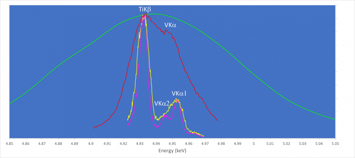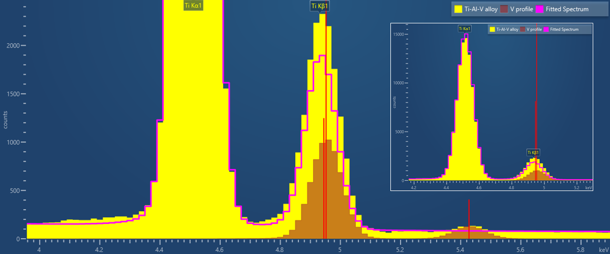 例如,在含有两种过渡元素钛和钒的材料中发现的常见但非常紧密的重叠。这是TiKb (4.932keV)和VKa (4.952keV)之间的重叠,对于研究Ti-V- al合金和Ti-V矿物的分析师来说尤其熟悉。这些线之间的距离只有20eV,实际上由于VKa的存在,距离要小一些2(4.945 kev行)。在这个能量下,好的EDS谱仪的能量分辨率在120eV左右,因此这两条线不能独立分辨。这可以从下面从Ti- 6al -V合金收集的EDS光谱中看到,其中钒信号表现为TiKb线高度的增加,只有在使用EDS软件显示单独的Ti和V贡献时才明显。