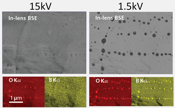 第一个例子来自JFE钢,是对钢中的沉淀物的研究。下图显示了在两种不同加速度电压下扫描的相同区域,首先是15kV,然后是1.5kV。我们可以在电子图像和EDS图中看到分辨率的提高,特别是表面灵敏度的提高,这揭示了MnOB纳米沉淀物的存在。