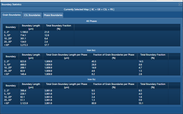 统计的其他边界类型(如网站重合点阵或阶段边界),这些将会出现在不同的选项卡显示,但前提是这些边界是绘制在当前地图。如果没有相关选项卡,这是因为边界不显示在地图上。同样重要的是要注意,AZtecCrystal计算边界的真实长度,考虑边界跟踪的方向。没有这个界限,面向在45°水平将边界长度√2倍的时间比他们的真实长度EBSD地图由于像素化的本质。AZtecCrystal使用一些行之有效的修正因素来确定二维长度在数字化空间(见,例如,维尔纳,模式识别字母12(1991)671 - 682年),所以你可以确信这些表中所示的结果。记住,鼠标右键单击表会让你所有的结果导出到一个文本文件格式。