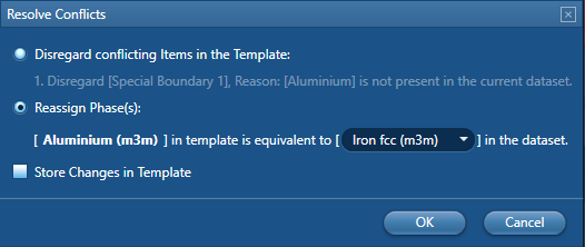你仍然可以使用这些模板,但系统会问你是否想无视冲突(在这种情况下,在本例中,它不会排除孪晶界的晶粒尺寸测量)或您是否想要重新分配阶段——在这里,我们可以双法应用于铁FCC阶段在我们的数据集,可以选择更新模板信息在任何后续应用程序中使用这个新阶段: