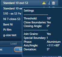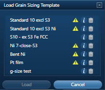 然后,当你想重用模板,您可以加载可用存储模板的列表。然而,该系统是足够聪明知道什么时候可能会有冲突问题在任何给定的模板——例如如果一个孪晶界被定义为一个特定的阶段,但这阶段不存在在当前数据集。在这种情况下模板将与三角形警告标志。在下面的情况下(在分析收集的数据从一个双钢样品),大量的粒度测量模板显示警告三角形(左图)。点击相邻的信息符号列表中的第一个模板告诉我们,它包括排除孪晶界的一个阶段(铝),不存在在当前数据集(右图):