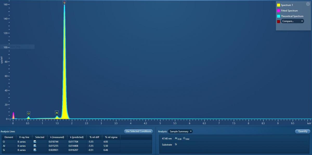 你可以看到,在光谱的右下方,我也有LayerProbe溶液-层的厚度已经被计算为47.4nm厚,铝和O在层中的比例已经被确定为分别为38%和62% at %。我们也有测量误差的方法。很容易就能得到结果。