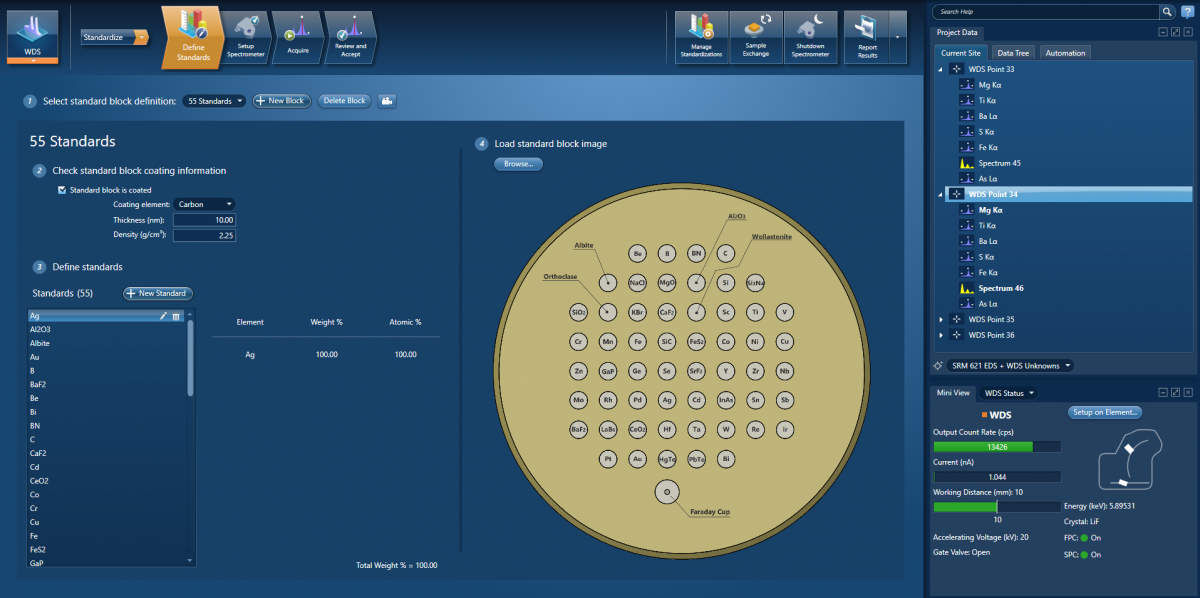 那么,这些新产品有什么特别之处呢?对于我们的新WDS系统AZtecWave,它是一种智能的方式,将全聚焦WDS探测器的功率(用于专用电子微探针系统)融入到我们最新的能量色散x射线能谱(EDS)系统AZtecLive的速度和方便。这使得它成为在扫描电镜上实现真正微探针- wds光谱分辨率的唯一系统。我们越来越有信心,我们在EDS软件中对量化“truu - q”算法所做的重要工作,使我们能够以wds精度分析主要元素组成。然而,当存在明显的x射线峰重叠或需要测量微量元素组成时,则需要WDS的分辨率和探测能力。正如您在前面的视频中所看到的,演示展示了痕量元素(在本例中是Si和Co)如何需要使用WDS进行分析,以及软件如何指导用户设置采集时间、束电流测量、背景信号收集和量化。在不到3分钟的时间内,使用EDS和WDS的组合,用户已经测量了该样品的组成到微探针精度。对于任何习惯使用我们的AZtec界面的人,布局是立即识别和直观的,如下所示,带来wds精度的许多实验室,无法证明购买和管理一个完整的电子微探针微分析系统所需的巨大费用。