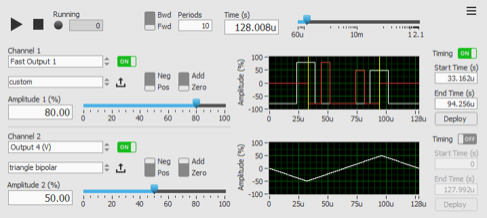 当需要定期应用相同的波形或脉冲序列时,功能生成器通常比脚本更简单,更有效地使用。任何自定义波形都可以上传并以频率生成周期性模式在500之间MHz通过使用高精度和低噪声20位输出来达到15 kHz。对于更高的振荡速率,功能生成器可以解决TSC提供1 MHz模拟带宽的单个快速模拟输出。
