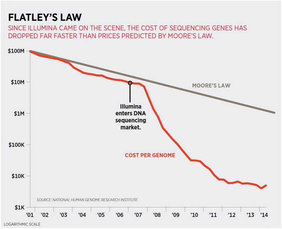 第一次DNA测序实验使用了一种费力的色谱技术。在基于荧光的方法发展和商业化之后,它变得更快和更容易。这使得科学家们在理解DNA方面取得了巨大的进步,并开发了一些突破性的应用。万博电脑网页版登录然而,这项技术所取得的最大成就是历时15年破译人类基因组(定义人类有机体的一组指令)的计划。这导致了在提高测序速度和降低测序成本的技术开发上的巨大投资。在过去的十多年里,这个成本从每个人类基因组的1亿美元下降到只有1000美元,比摩尔定律影响的要快,摩尔定律被称为弗拉特利定律,以其当时的首席执行官Jay Flateley的名字命名Illumina公司。公司。这是这场革命背后的驱动力。